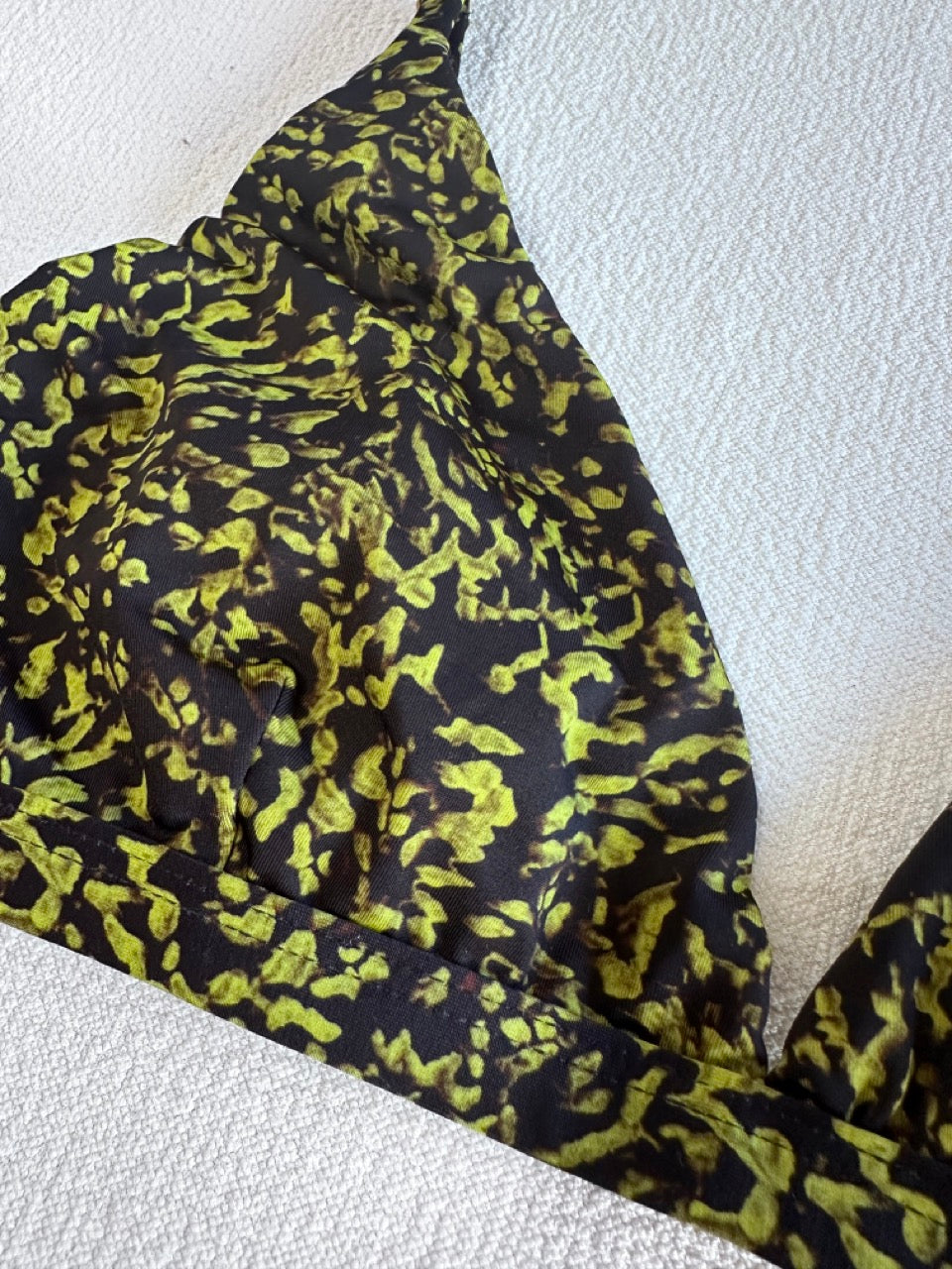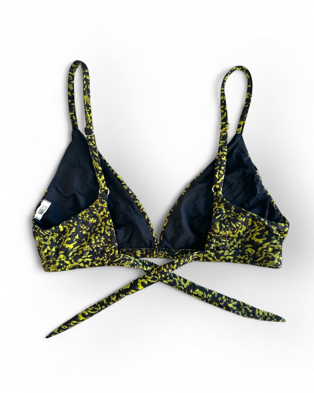 Top Triângulo Fixo com fecho de nó, alças reguláveis e abertura nas laterais do forro para inserir bojo.