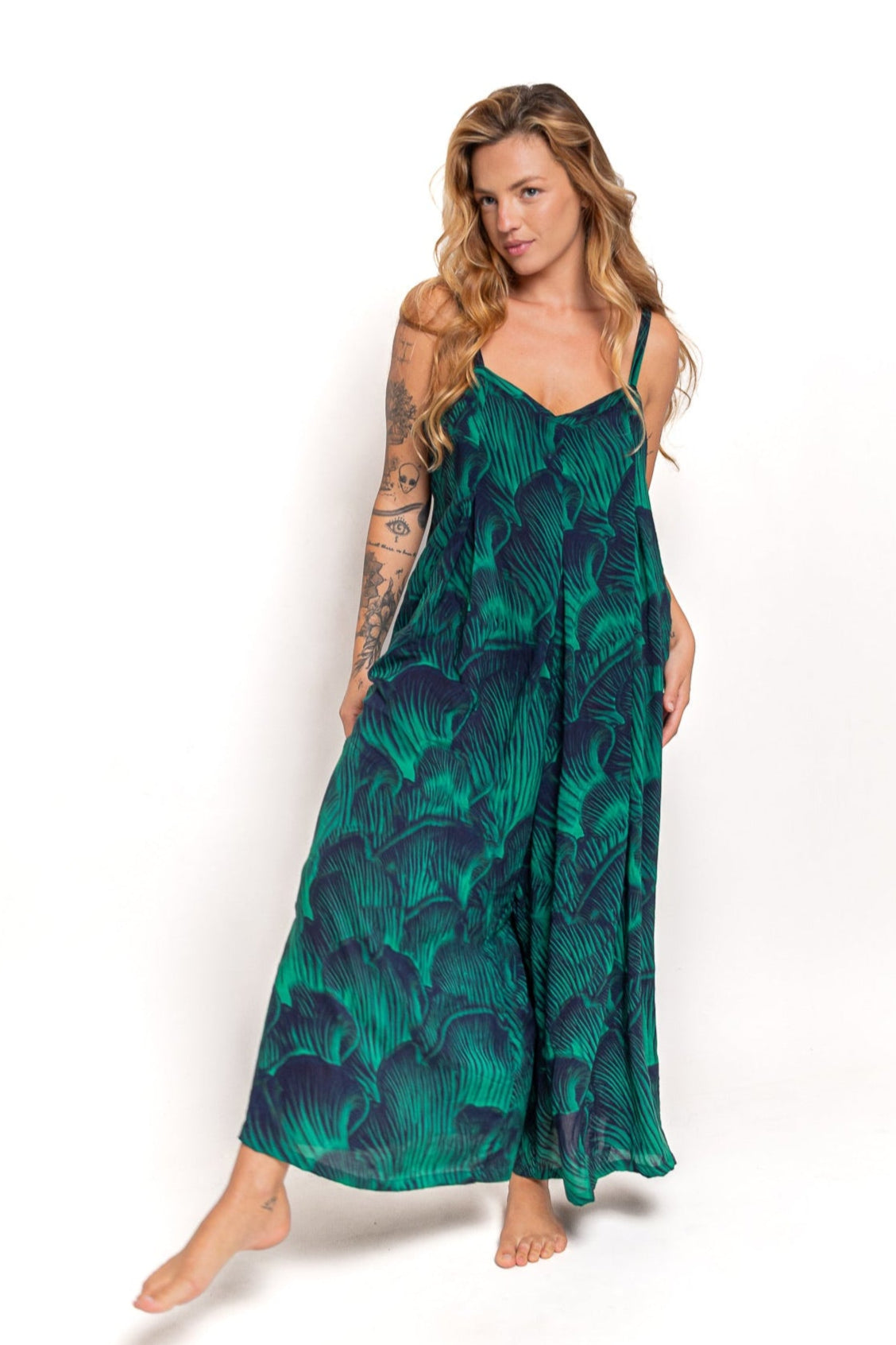 Macacão feito de viscose certificada. Modelagem com caimento perfeito, recorte solto para trazer leveza.